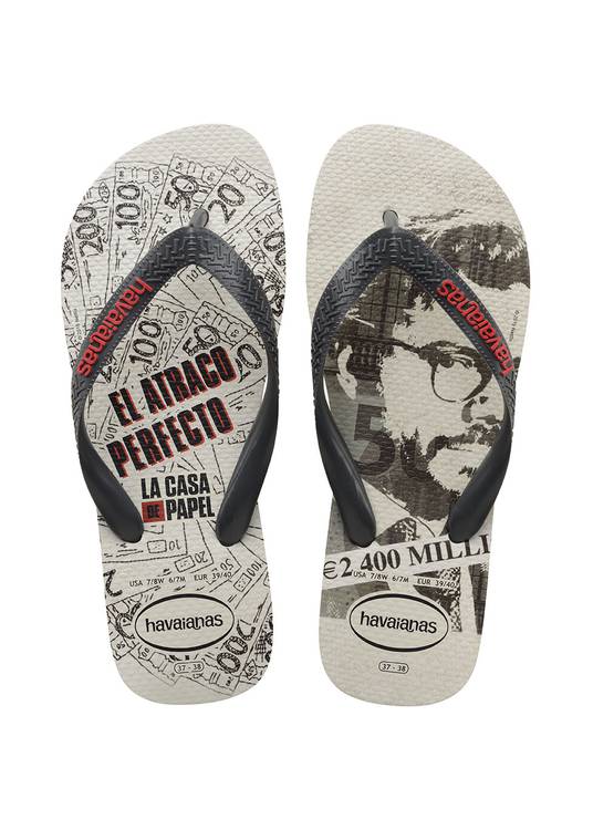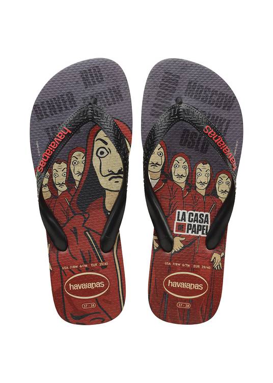 As Havaianas, em parceria com a Netflix, lançaram uma coleção de sandálias inspiradas nas amadas séries “La Casa de Papel” e “Stranger Things”. São quatro modelos, dos tamanhos 33/34 ao 45/46, e estão disponíveis nas lojas e no site da marca.