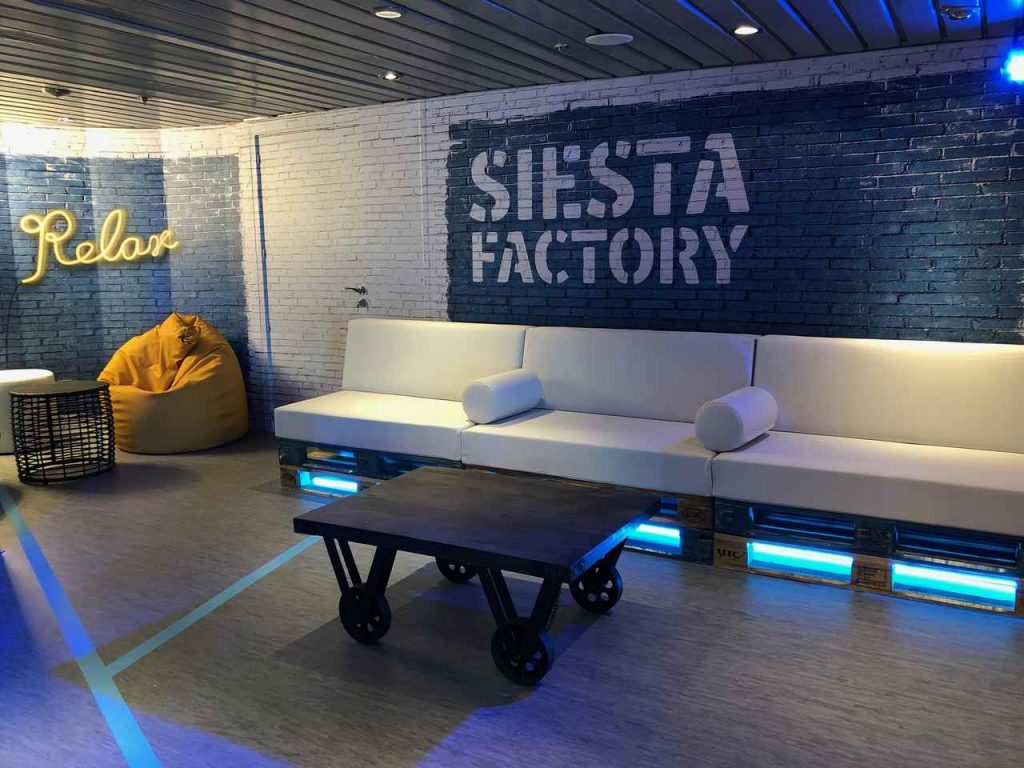Para descansar, The Factory possui uma área de relaxamento, a área chill-out, onde é possível repousar ou tirar uma soneca para recarregar as baterias entre uma atividade e outra. O novo programa já está disponível nos navios Sovereign e Horizon e, a partir de outubro, estará no Monarch.