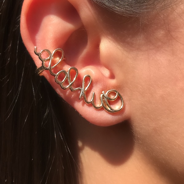 - Unilateral – Em apenas uma orelha, o ear cuff compõe um look assimétrico e delicado. Nesse caso os personalizados com palavras ou com pedras cravejadas são tendências que trazem várias possibilidades nas produções.