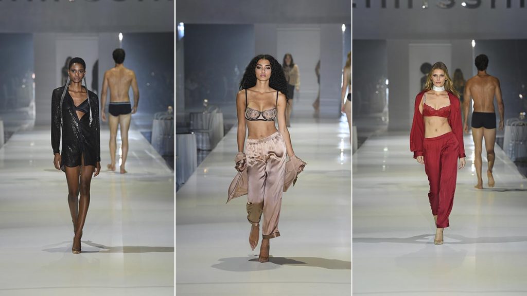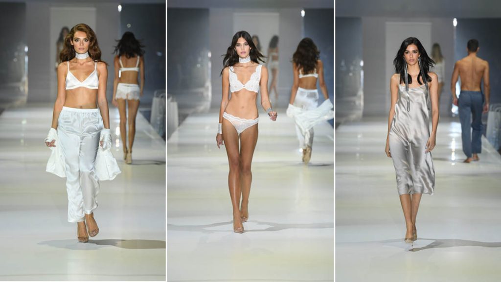 No palco, a coleção de lingerie outono/inverno 2019-20 deslizou pela passarela: sutiãs triangulares e calcinhas francesas em renda, sutiãs balconette floridos ton sur ton com calcinhas em harmonia, sutiãs bandeau e bodysuits em renda, e novos tops de sutiã em couro stretch. E depois há as estampas: leopardo e píton em tule, xadrez, e polka dots. Para a noite, veludo dévoré com franja em coquete, renda dentelle estilo boudoir e pontos de ouro embelezam a lingerie.