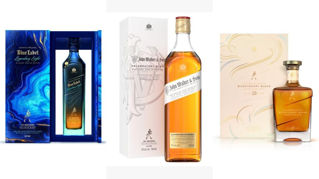 Entre os meses de setembro e dezembro, as linhas Johnnie Walker Gold Label e Johnnie Walker Blue Label também ganham suas embalagens comemorativas de 200 anos. A garrafa de Gold Label, com design singular e produzida em tons dourados, remete às tradicionais camadas de frutas, baunilha, especiarias e defumação. Já Blue Label traz uma caixa especial e comemorativa com ilustrações que mostram a história da família Walker, prestando homenagem às cidades que fizeram a história da marca nos últimos dois séculos.