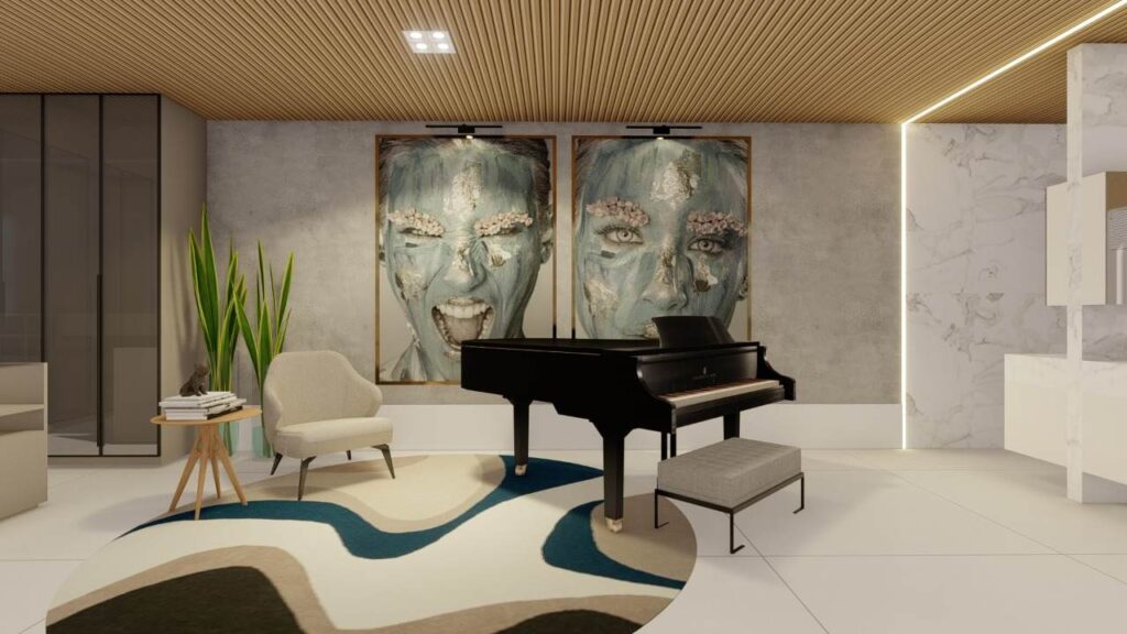 As irmãs e sócias Ana Paula Nonato e Ana Cláudia Nonato do escritório Dois A Arquitetura enaltecem a música brasileira, no ambiente batizado de “Música Congelada”, na Casas Conceito Virtual Experience. Um dos destaques da decoração é um elegante piano de caldas, localizado no haal do primeiro andar do espaço, que traz a natureza, o mar, o requinte e a arte para criar um lar aconchegante e contemporâneo.