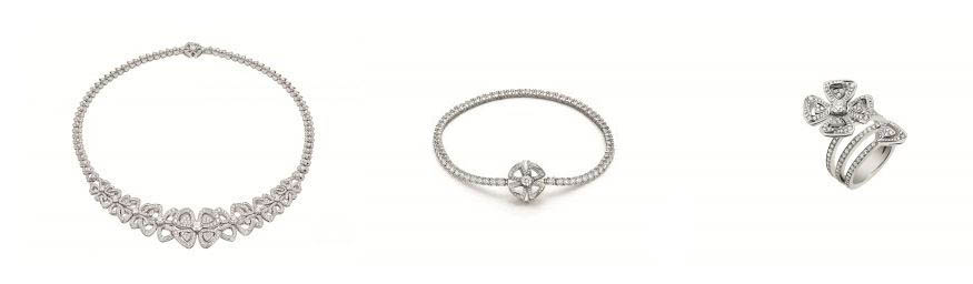 Completando o adornamento, uma deslumbrante pulseira de ouro branco e diamante, especificamente projetada para oferecer uma fácil e confortável vestibilidade com seu novo e prático fechamento que desaparece magicamente dentro da cintilante flor única embelezando a peça. Um conjunto de joias com apelo universal, ele joga na refinada combinação entre o estilo ‘tennis’ de diamante atemporal do tênis e o panache extra dado pelo motivo da flor.