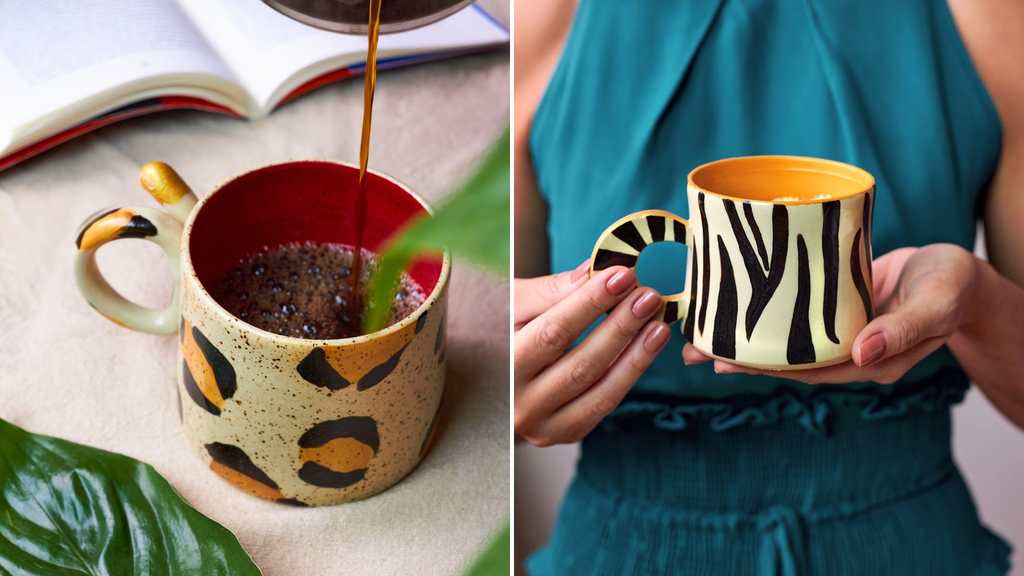 Serão dois modelos de caneca, sendo ambos em animal print, um de zebra e um de onça. Para a cartela de cores foram usados tons terrosos e preto com pontos de cor em vermelho, amarelo e dourado.