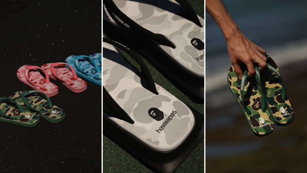 São cinco modelos diferentes para o deleite dos colecionadores de collabs, que traz três versões do clássico modelo Haiavainas Top, nas cores rosa, azul e verde camuflados com o famoso print da BAPE; e claro, as já icônicas Tradi Zori nas versões preta e branca.