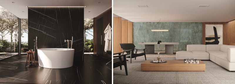Mas se engana quem pensa que o mármore está restrito a projetos de estilo clássico! Ambiente contemporâneos podem explorá-lo em leituras mais exóticas, com uma personalidade mais atual e cosmopolita. É o caso da linha Sahara Noir e Topázio, com tons marcantes e tendência no décor.