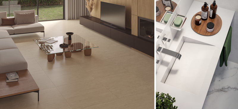 Não é sem motivo que ele é normalmente associado aos mármores – como a linha Athea (foto em destaque da matéria), da Roca Cerámica, inspirada no mármore Onix. A linha Palace , por sua vez, traz peças de SuperFormato que evocam a arquitetura palaciana, com todo seu requinte.