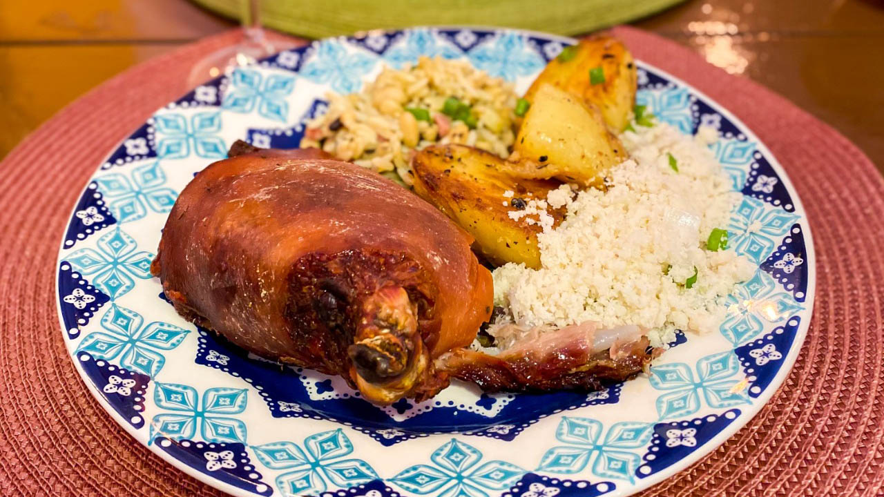 Com influência do assado à bairrada, a chef Emanuele Nascimento não revela a sua técnica de marinação com ervas, que dar um sabor único e especial ao leitão. após assar, no mínimo três horas. O resultado é uma carne deliciosa, leve e que desmancha no corte.