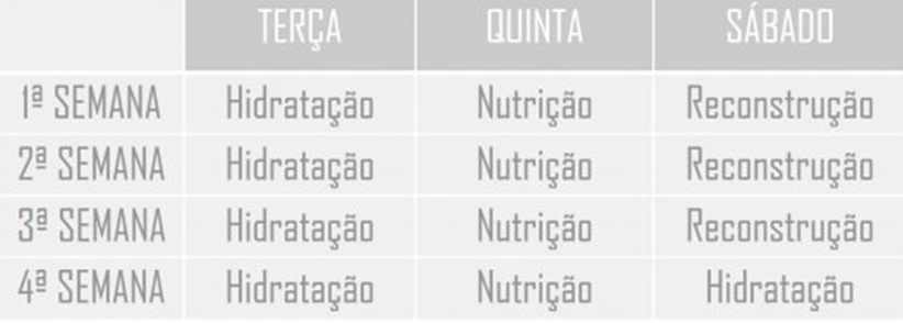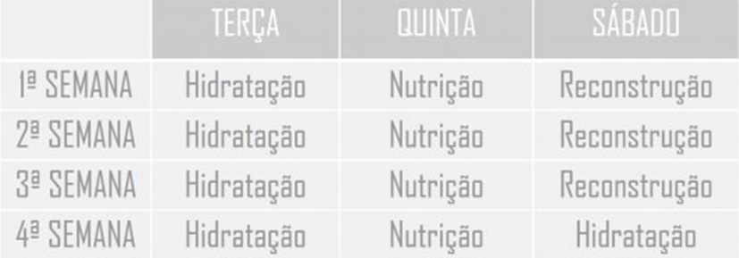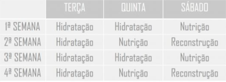 O cronograma capilar é indicado para todos os tipos e curvaturas de cabelo que estejam precisando de cuidados especiais e recuperação. O tratamento deve ser feito três vezes por semana durante o mês inteiro, intercalando hidratação, nutrição e reconstrução, em que cada uma possui uma função específica e crucial dentro do processo. Entenda cada etapa e seus objetivos: