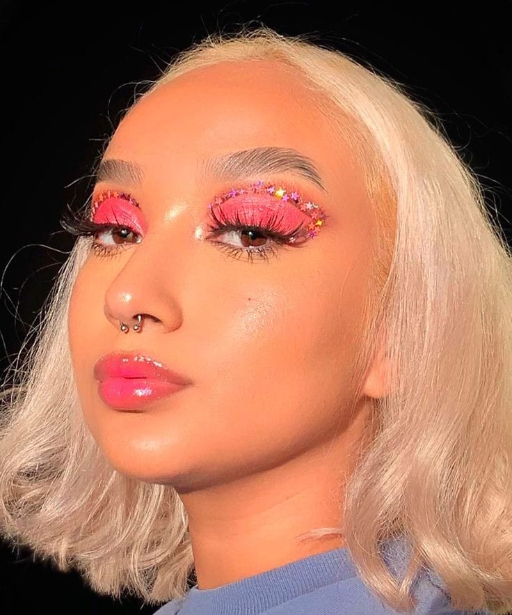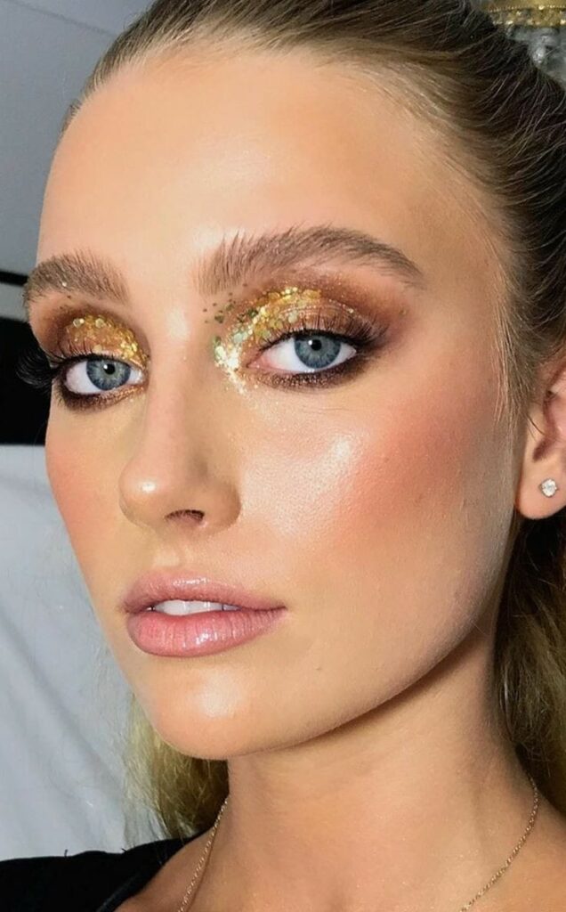 O glitter nunca sai de moda nos festivais. Ele pode ser usado para complementar uma maquiagem mais neutra ou ser o protagonista de um estilo com mais brilho. Esses detalhes são geralmente feitos nos olhos, tanto nas pálpebras como nas laterais, acompanhados de um delineado.