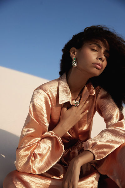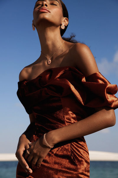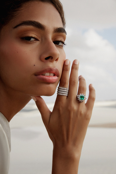 As novas jóias contam com cores e designs que fazem referências visuais à natureza através do verde das esmeraldas, roxo das tanzanitas e diversidade de tons azuis nas turmalinas paraíbas, topázio sky e água marinha, com as três cores de ouro, rosa, amarelo e branco. Presente também, estão o coral peaux d’ange e os eternos diamantes. As texturas das peças são destaque graças ao seu trabalho único e artesanal.