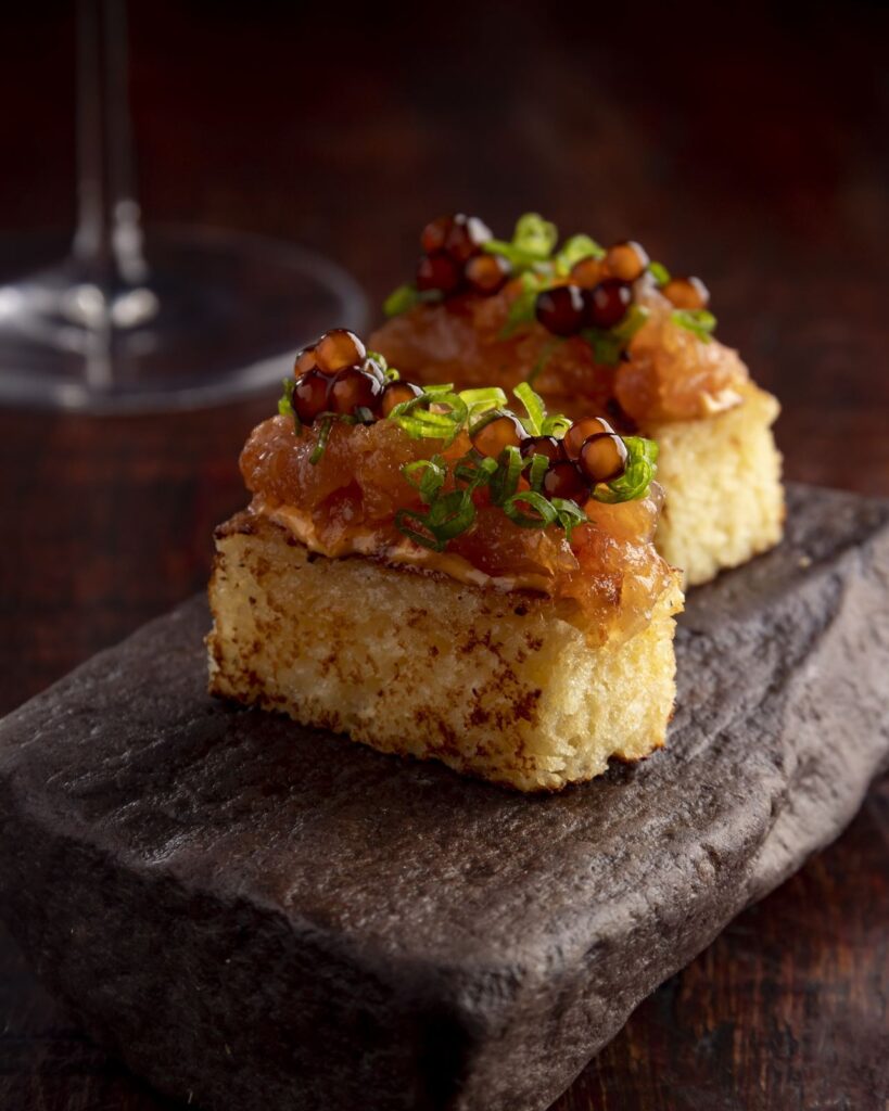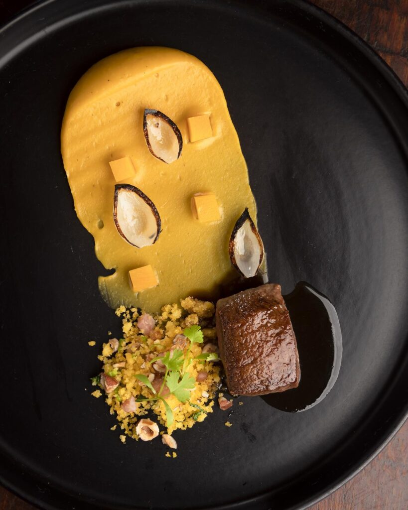 Dos 14 anos vividos nos Estados Unidos – onde se formou pela tradicional escola de gastronomia Le Cordon Bleu e ganhou experiência na luxuosa rede de hotéis The Ritz-Carlton – às expedições pelos diversos biomas e territórios de identidade da Bahia com o Instituto Ori, o caminho de Fabrício Lemos está refletido em pratos como a carne do sol com farofa de garimpeiro, mousseline de godó e cortadinho de palma que encerra, eventualmente, a parte salgada do menu. Já as sobremesas de Lisiane Arouca têm o sabor da infância em Amargosa, cidade do interior do estado onde a chef-pâtissière cresceu.