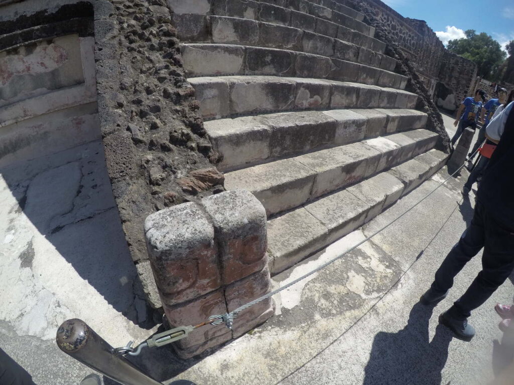 A geografia é fácil de entender. Há a pirâmide da lua, menor, a avenida dos mortos, como os astecas a batizaram, com diversas outras pirâmides pequenas e,ao final, a pirâmide do Sol, a terceira maior do mundo. E é nela que todos sobem, só é preciso tomar cuidado pois as escadas são quase na horizontal e, mais importante, estamos a 2.300 metros acima do nível do mar, com o ar mais rarefeito, fazendo a gente cansar mais.