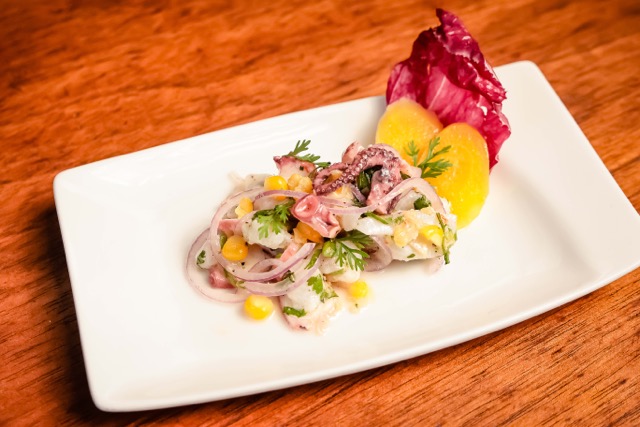 Ceviche de robalo e polvo com milho verde e batata baroa