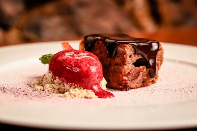 Tortinha de chocolate com calda de licor de cacau, frutas secas, especiarias e sorbet de frutas vermelhas