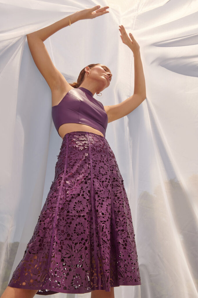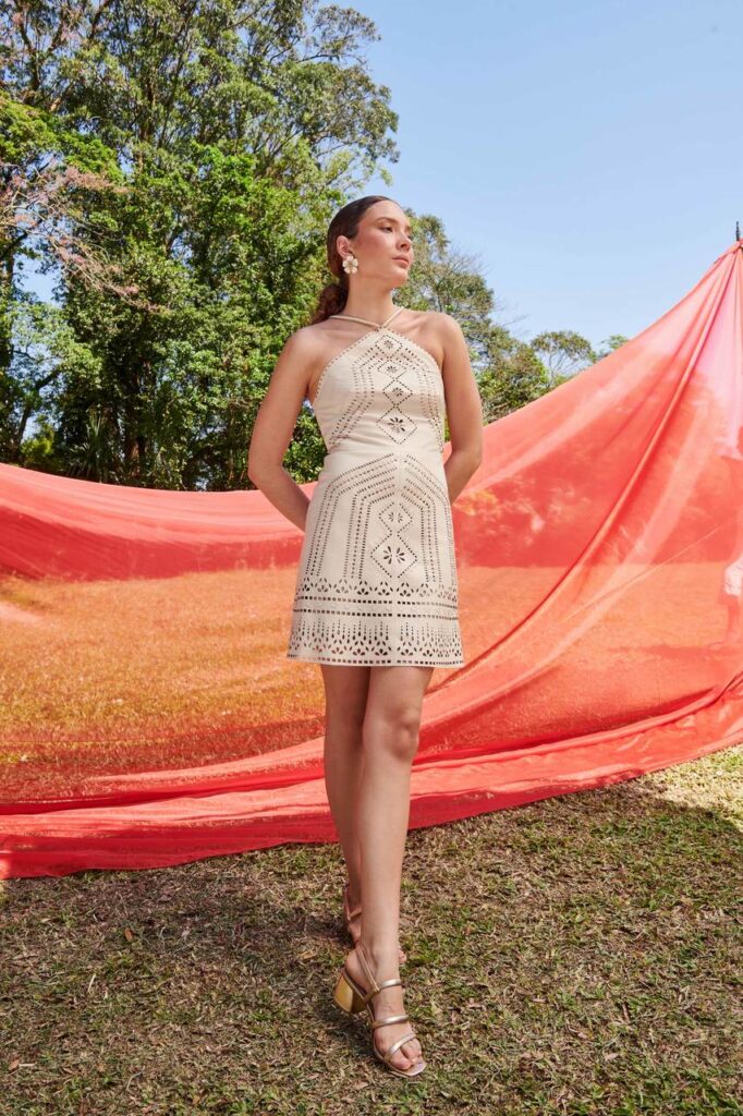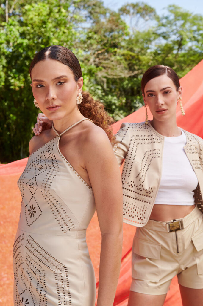 As modelagens são atemporais e para a estação as peças must have são saias midis e vestidos, com destaque para os bordados e rendados a laser.
