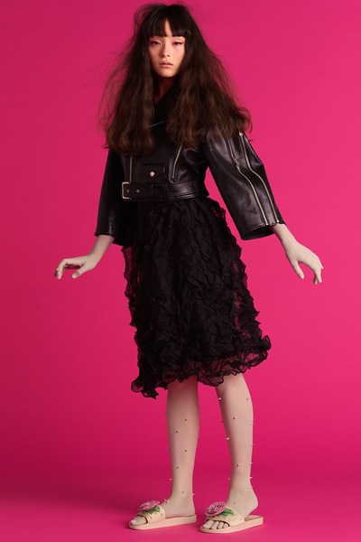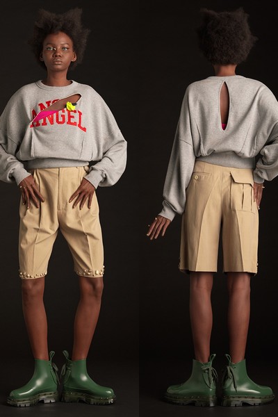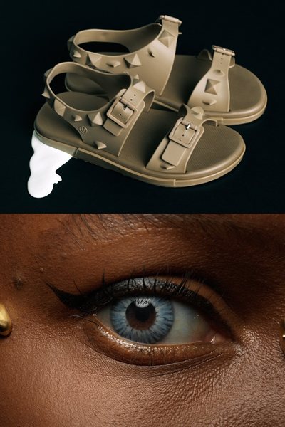 As sandálias prontas para o clima quente continuam carregando a energia corajosa da coleção, com uma abundância de grandes pontas geométricas ao lado de fivelas práticas, os slides são adornados com rosas e spikes enormes. Baseando a variedade de sapatos está a Melissa Razor Bow Bag, com uma fita afiada e farpas combinando e é peça desejo da coleção.