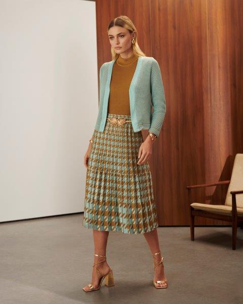 Os vestidos contam com modelagem mais soltas e ressaltam a sensualidade feminina, sem deixar a elegância proposta na estação de lado, além das tiras com brilho, novos caimentos também aparece, deixando o ombro em destaque. As saias trazem o tricot de forma fluída e ganham vida a partir de detalhes com aplicações de strass, babados e fendas. Já os croppeds, blusas e blazers refletem o brilho da tendência atual.