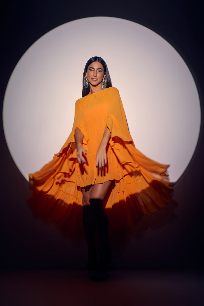 O couro, jeans, verniz, metalizado e o paetê predominam os tecidos, representando as tendências dos anos 90 e 2000’s. Vestidos curtos e longos fluidos, croppeds cut-out, jaquetas verniz, croppeds e blazers oversizes foram atualizados com o visual e DNA autêntico da marca e olhar fashionista da influenciadora.