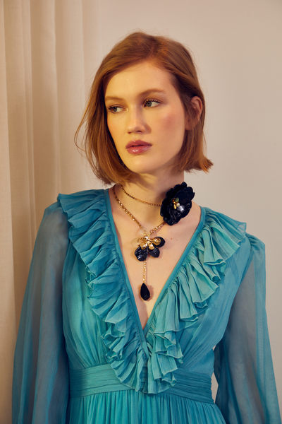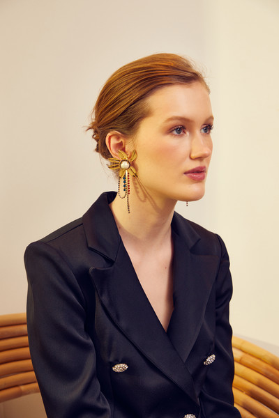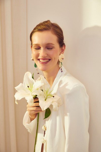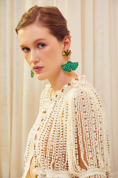 O destaque fica por conta das flores maximalistas em grande parte da coleção, além de pérolas, pétalas e formas orgânicas. A coleção aposta nas peças confeccionadas em acrílico e com uma cartela de cores dominada por tons de verde, marfim, preto, off white e dourado.