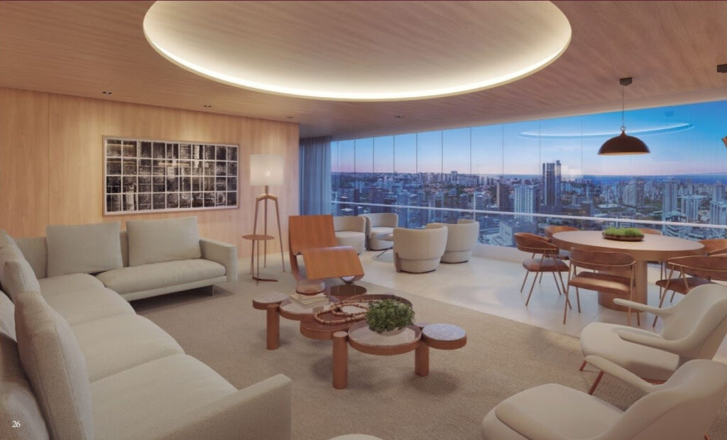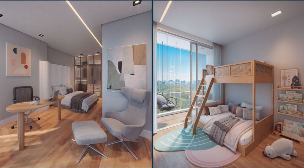 Já a Architects+Co sugere uma atmosfera aconchegante, sem perder de vista a funcionalidade dos ambientes. Mesclando elementos clássicos com toques de sofisticação, encontra-se o equilíbrio ideal para os futuros moradores. Para isso, foram utilizados tons neutros nos móveis e materiais clássicos nos revestimentos, como por exemplo, a madeira, que se mostra presente em diversos cômodos e é um elemento de destaque.