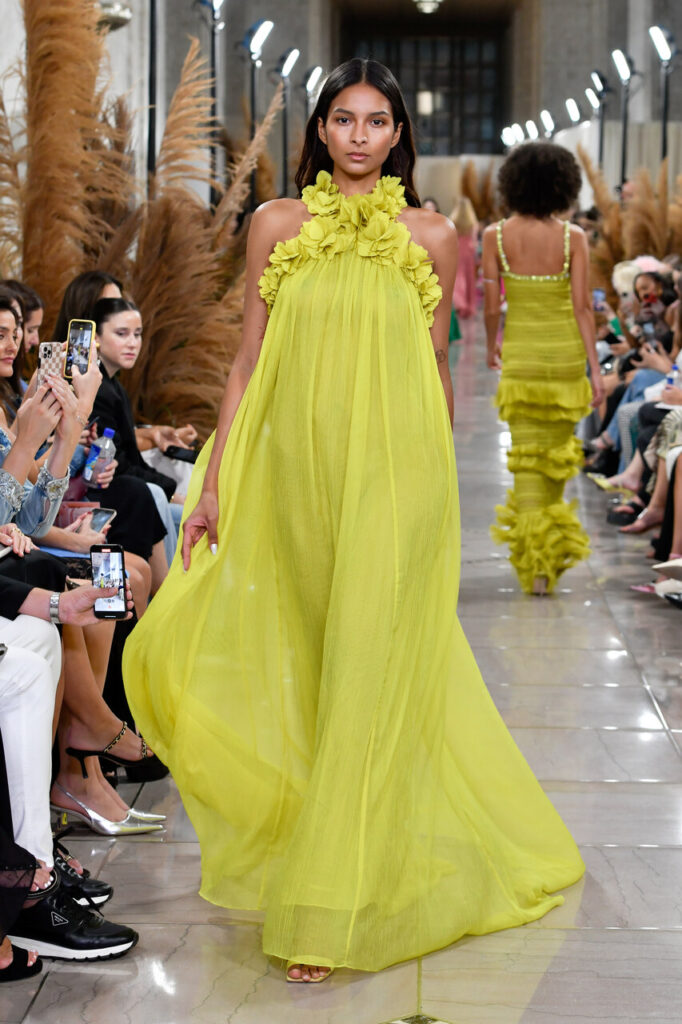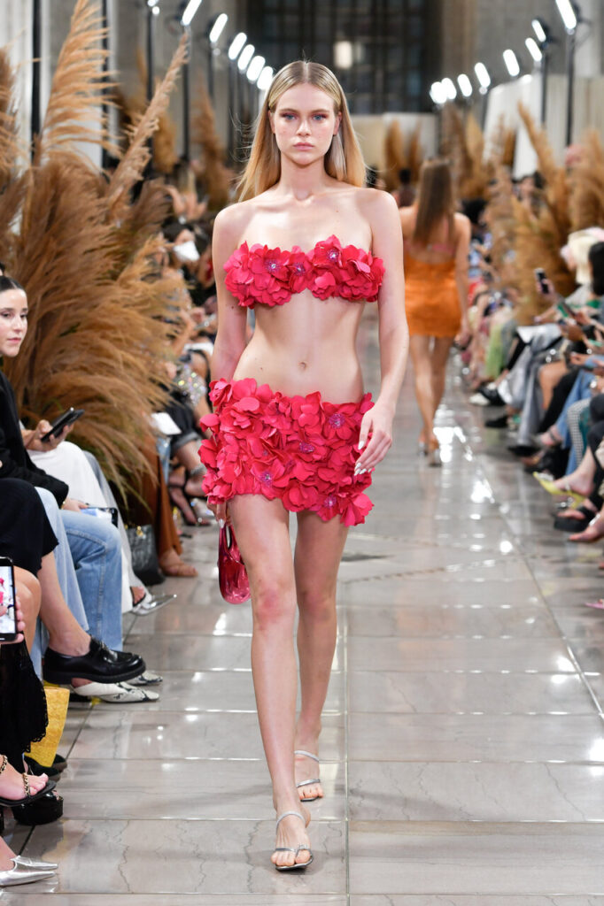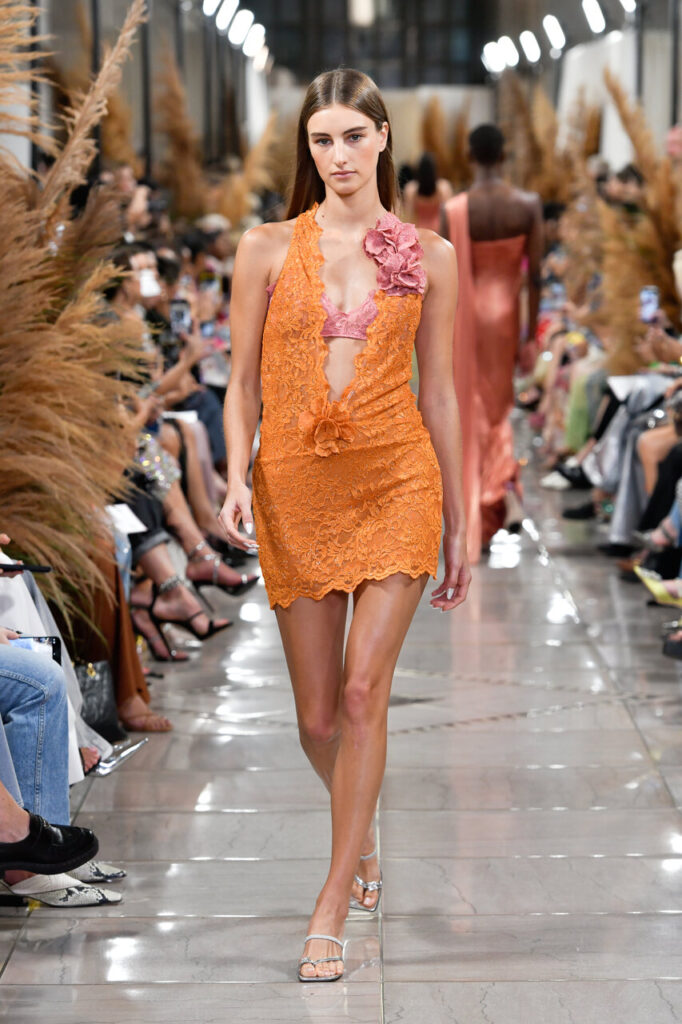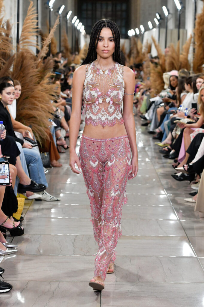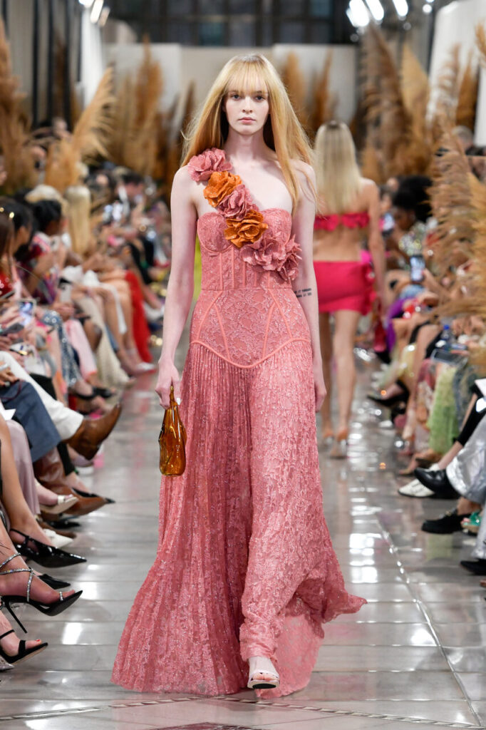 A renda metálica em tons como Apricot e Rosa Seco, evocando um ar vintage, enriquece a paleta de cores, enquanto o corset influência vestidos esvoaçantes. O beachwear couture apresenta jersey com foil, combinando maxi flores e pedrarias de forma artesanal.