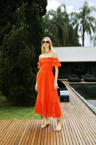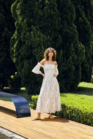 Mantendo o frescor para o período mais quente, a laise ganha versões atemporais de conjuntos de saia e top, além de vestidos midi, peças-chave para a mala de viagens. Destaque para o vestido Tamara, que traz o decote ombro a ombro, mangas sino curta e caimento evasê no laranja. Por fim, o Adrieli conta com detalhes de babados no decote, disponível no amarelo e branco.