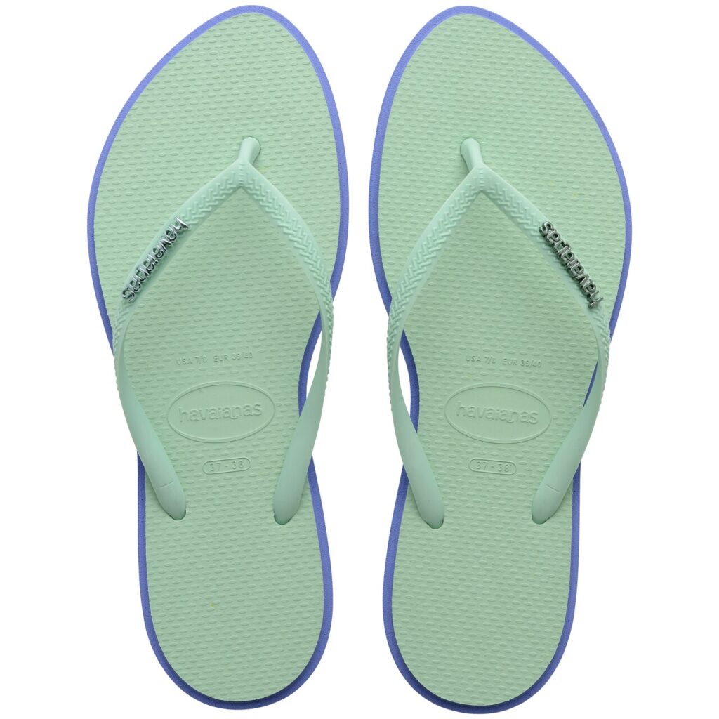 A Havaianas Slim Point tem bordas e laterais em cores que contrastam com os tons pastéis da sola e das tiras finas com logo metálico, criando um efeito moderno e colorido. Suas combinações de cores são a Azul Provence (mix de azul e verde-claro), a Amaranto (mix de lilás e vinho) e o Verde Pantanal (mix de areia e verde-escuro), ideais para quem não dispensa o estilo e a atitude brasileira.