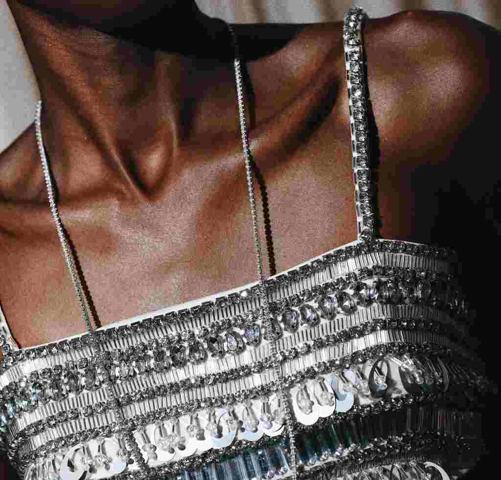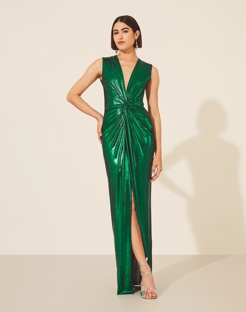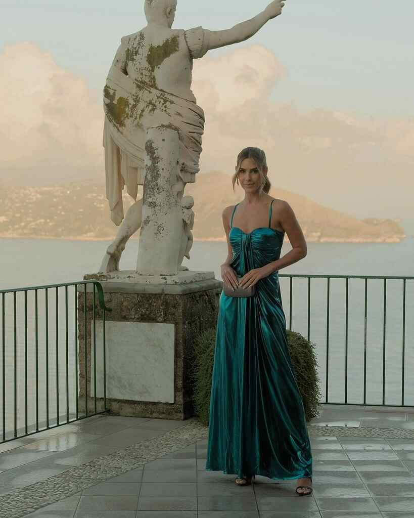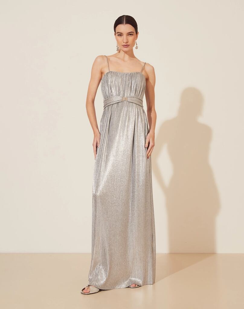 perfeitamente no espaço do decote, o colar adiciona um toque delicado e refinado, criando uma harmonia perfeita entre a peça de roupa e a joia. O vestido de lamê fica perfeito para o Natal, aproveite!