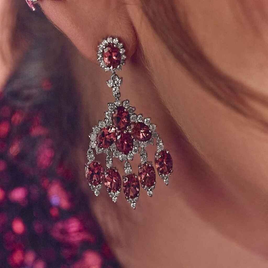 adicionando um toque de glamour à área do pescoço e dos pulsos. Essa combinação cria uma harmonia entre o destaque nos brincos e a sutileza do decote, resultando em uma aparência sofisticada e equilibrada ideal para um evento chique de celebração com os amigos.
