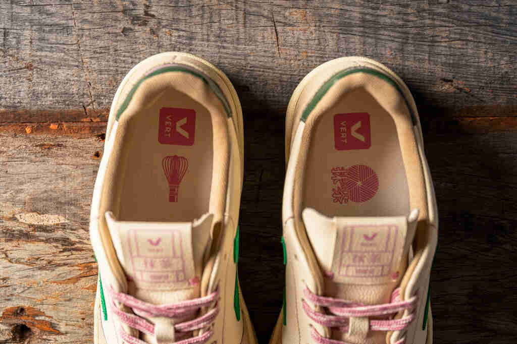 A silhueta escolhida é o clássico V-10 da VERT (R$ 790,00), com cores exclusivas remetendo ao verde do chá, detalhes em rosa e tons de verde, além de símbolos e mensagens alusivas à cultura do matcha.