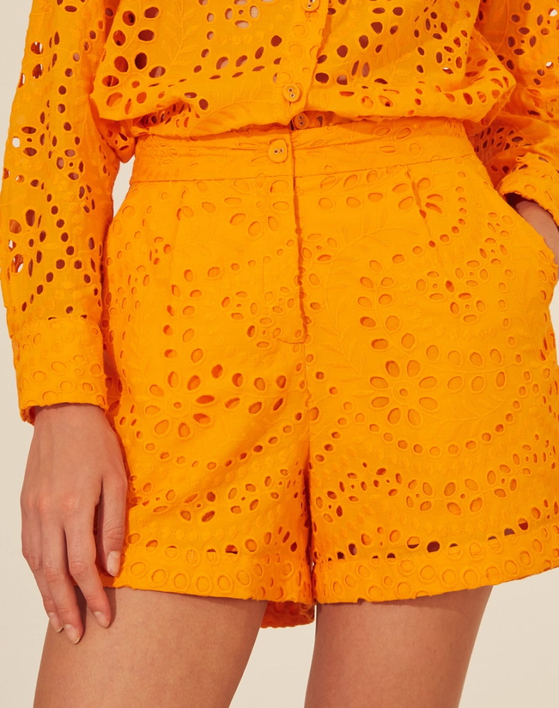 O short em laise se tornou o queridinho da estação. Todo o bordado do tecido traz um mix víntage para ser usado com regatas ou tops, além de dar match com acessórios como cintos, colares e broches. O tecido fresco e fashion nas cores laranja, verde, marrom e off white é a peça-chave para arrasar em 2024!