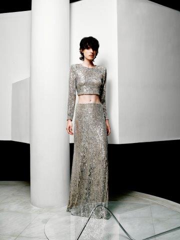 A linha festa da marca recebe as inspirações do luxo e do glamour das noites para criações de peças sofisticadas como o conjunto Hanna, composto por blusa com gola redonda, modelagem slim e saia longa reta, ambos no prateado, aposta da coleção. Os vestidos ganham destaque com diferentes sugestões com fendas, mangas com efeito capa e decote V.