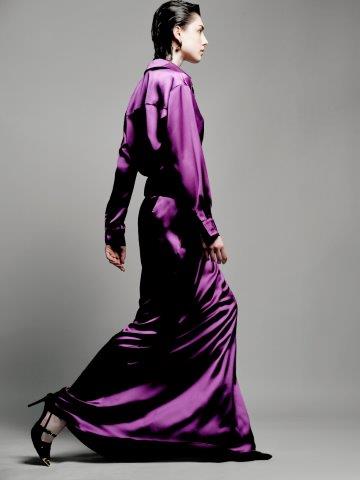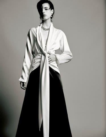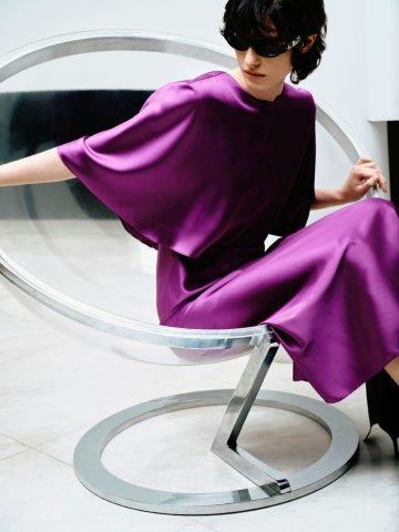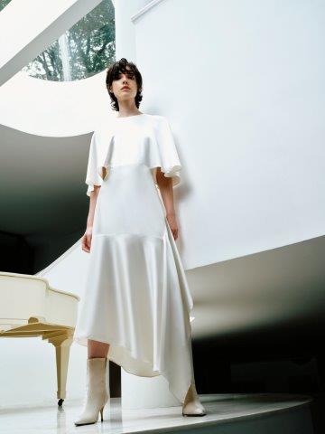 Transitando entre o atemporal e o cool, o conjunto Teresa, feito de cetim, traz a camisa e a saia longa com textura brilhosa e macia. Recortes assimétricos dão destaque para vestidos com designs trabalhados nos babados, transparência, fendas e amplitude, em cores neutras e modernas, todas ao estilo clássico e minimalista.