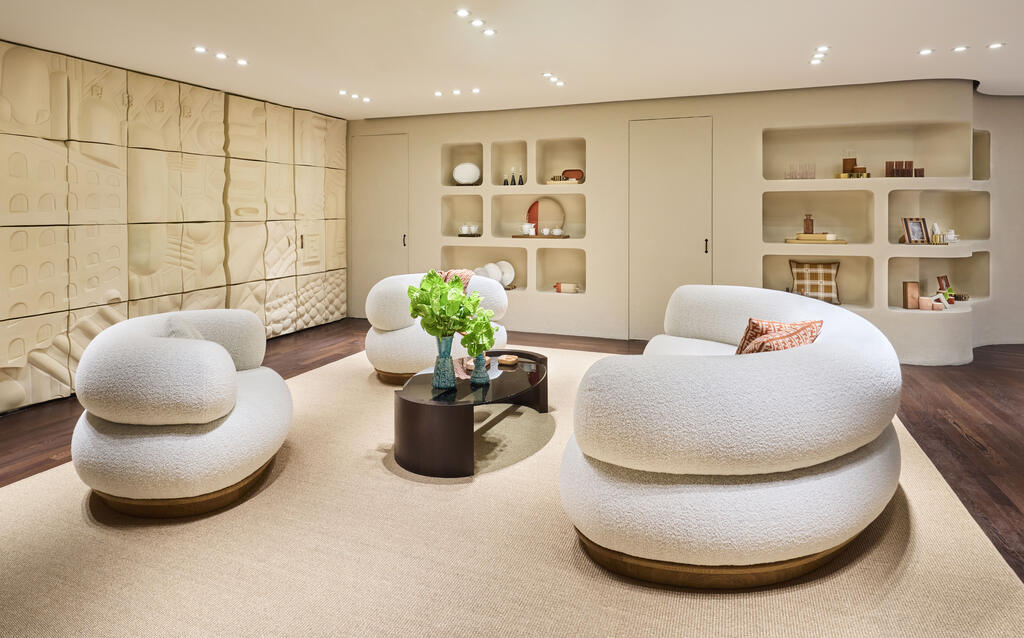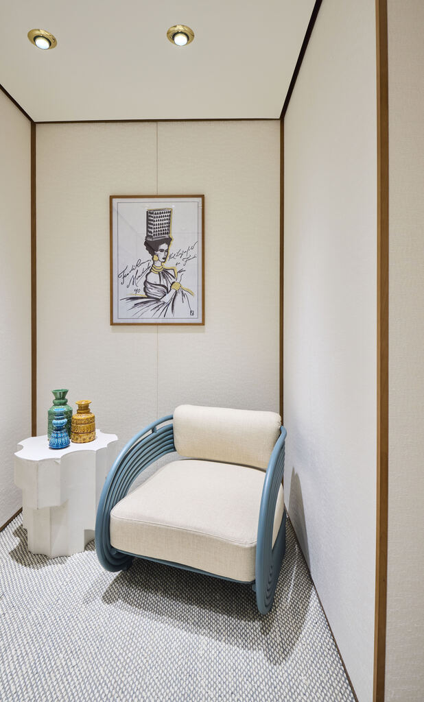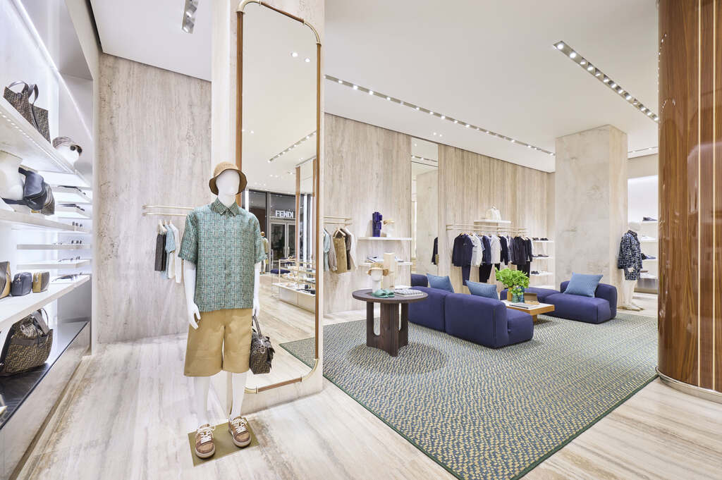 A sala principal apresenta um piso e paredes em mármore travertino Ocean, enquanto os nichos laterais exibem as icônicas bolsas FENDI. Detalhes como espelhos de madeira e metal, tapetes artesanais em fibra natural de agave e vasos de cerâmica feitos sob medida complementam a atmosfera exclusiva da boutique.