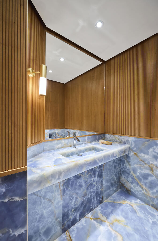 O design da loja incorpora elementos que evocam a atmosfera da região, com luminárias artesanais de vidro texturizado destacando a fachada e criando um diálogo entre interior e exterior. Ao adentrar, os visitantes são recebidos por uma estética luxuosa inspirada no universo náutico, com destaque para um cubo em madeira tridimensional que lembra um convés de barco.