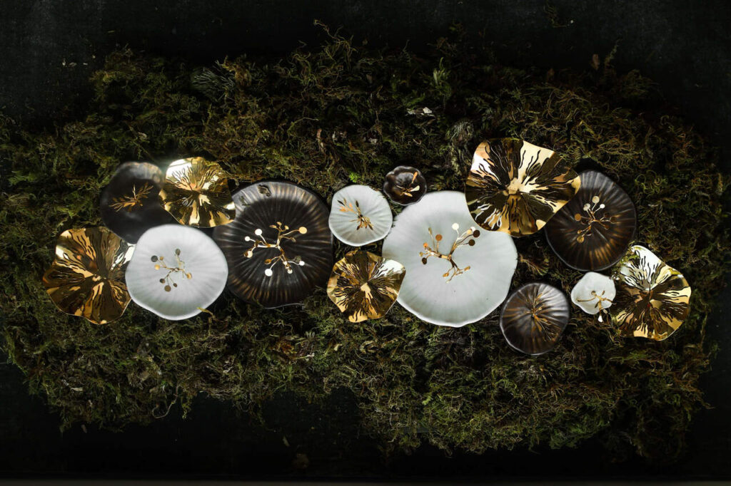 Outra tendência que ganha força, adicionando um toque de brilho e glamour tanto aos looks de moda quanto aos elementos decorativos de interiores. Neste contexto, ganha destaque as jóias de parede, esculturas e peças de design, em sua grande maioria banhadas a ouro para adornar a casa, como das artistas Nara Ota, Fabiane Queiroga, By Gabs entre outras.