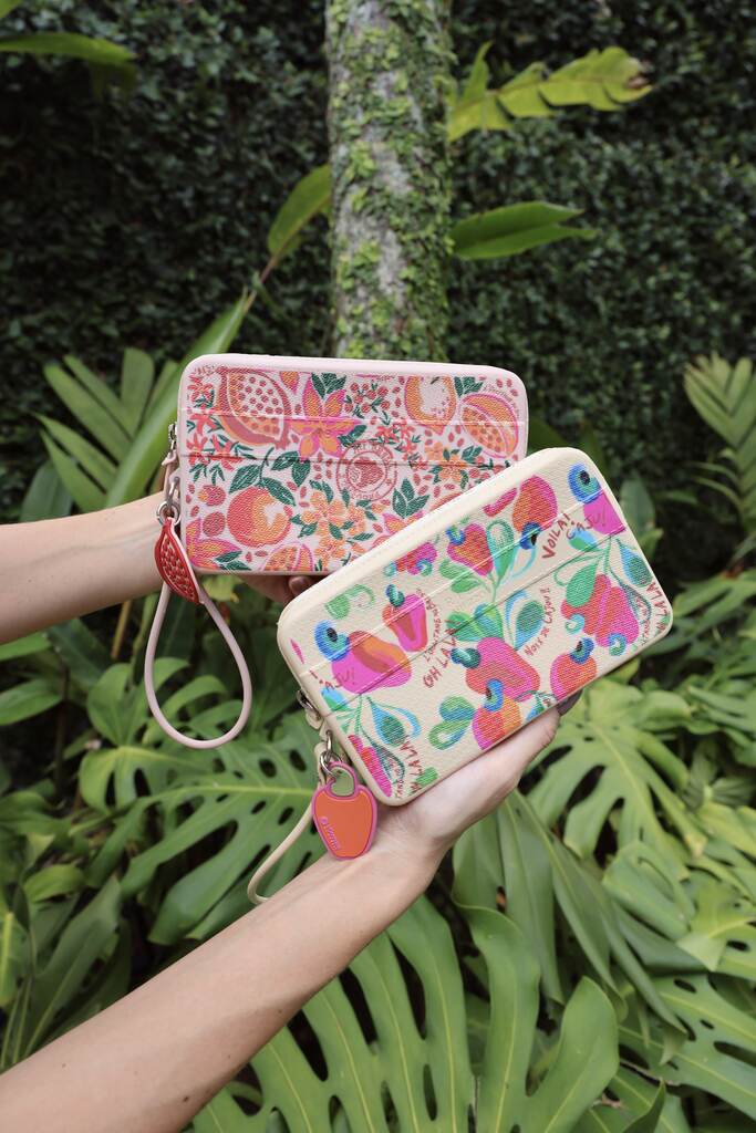 Entre os principais itens da collab, os flip flops com formato square trazem um toque contemporâneo e elegante ao modelo tradicional, enriquecidos com estampas em aquarela. O kit exclusivo ainda inclui uma bolsa funcional e estilosa, pensada tanto para momentos de lazer quanto para presentear. A clutch Malu, um clássico da Brizza, também ganha uma releitura com ilustrações delicadas de caju e romã, acompanhadas de chaveiros que acrescentam um charme especial. Já a tote puffer, versátil e espaçosa, combina design moderno e praticidade para a rotina.