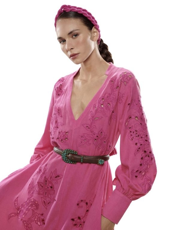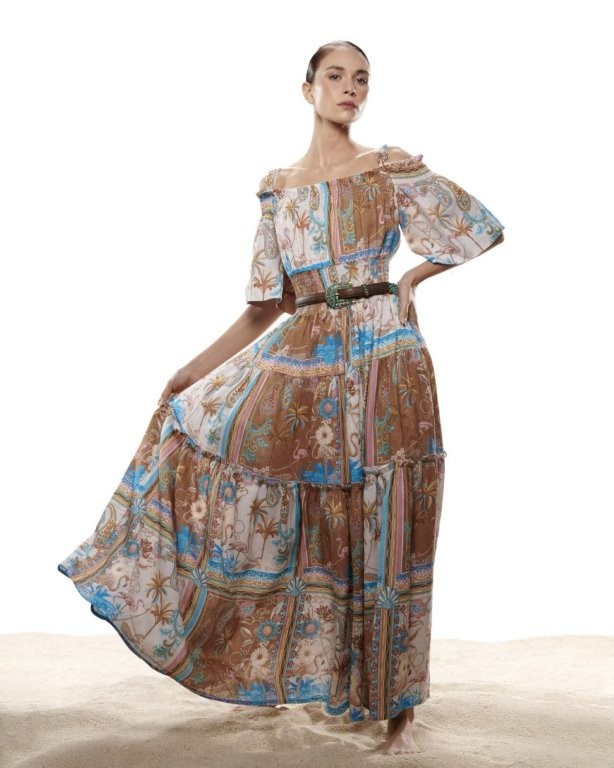 Entre os destaques da coleção estão o Vestido Aria, de tricot, com detalhes em pedra turquesa; a família Paradisus, que fortalece a proposta da coleção com sua padronagem exclusiva; e o Vestido Mahima, com mangas bufantes, bordado minucioso e cinto coordenado que valoriza ainda mais a silhueta.