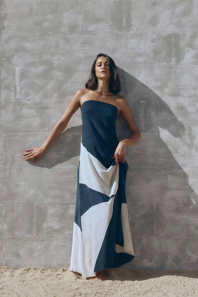 Já nas roupas, as modelagens amplas garantem conforto e elegância. A tricoline listrada e o fio tinto ganham espaço em peças de alfaiataria descomplicada, ideais para transitar da praia ao pós-praia com estilo. Kimonos com amarrações, vestidos com alça triângulo e shapes fluidos trazem um ar casual refinado à coleção. Uma das apostas em produtos é o vestido em seda da estampa ABSTRATA.