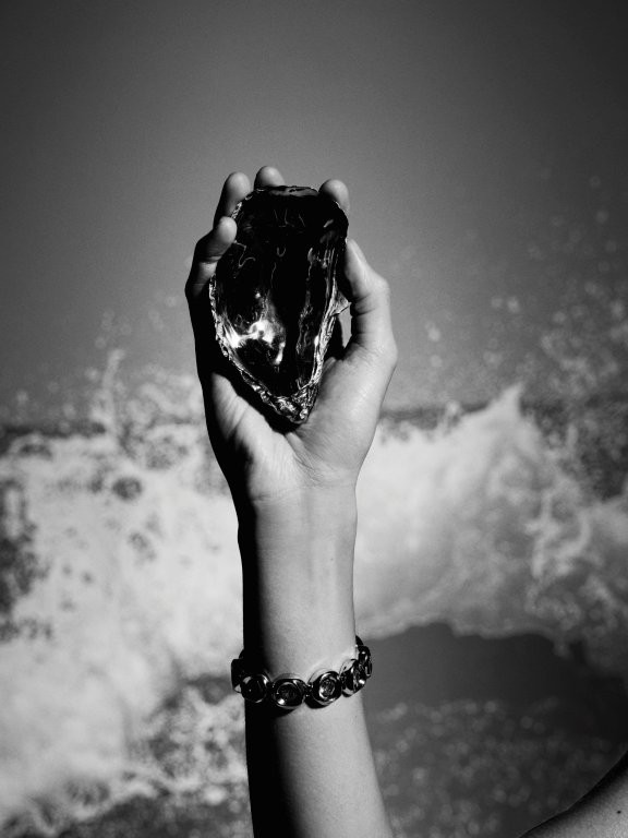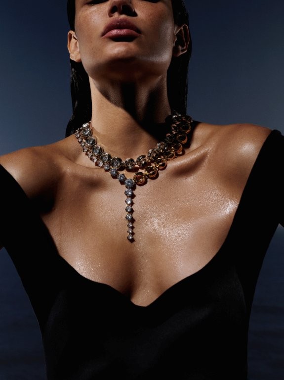 Os elementos marítimos se revelam em peças esculpidas organicamente com círculos, curvas e linhas que evocam o vai e vem das ondas. O movimento do mar se reflete em volumetrias suaves e no uso de cristais em diferentes tamanhos e lapidações, criando um jogo luz que remete ao brilho da água sob o Sol. A paleta, que mescla banhos dourados e prateados, explora o toque criativo da coleção.
