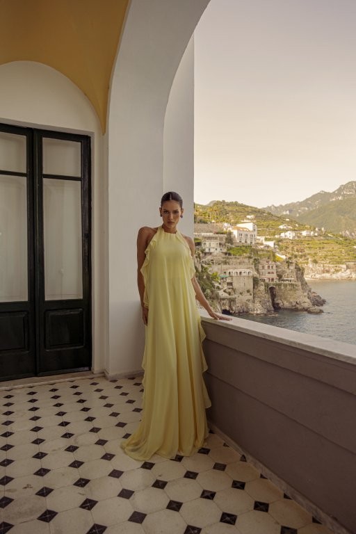 A coleção aposta em shapes fluidos, cinturas bem definidas e bordados com pedrarias. A paleta de cores transita entre tons suaves, como amarelo manteiga, verde claro e azul acinzentado, que remetem à leveza das vilas à beira-mar. Já os tons mais vibrantes, como o avocado, lima, esmeralda e verde bandeira, evocam a força da natureza e a exuberância das paisagens italianas.