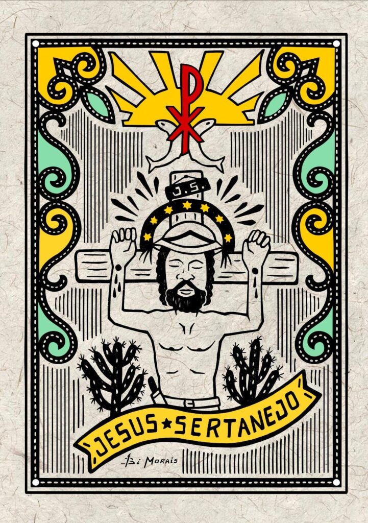 “Percebi a recorrência de alguns temas sempre presentes na obra de Gonzagão e uma deles é a religiosidade sertaneja. Através disso, eu comecei a criar desenhos baseados nas xilogravuras nordestinas, desenvolvendo e estudando um novo traço que remetesse às características presentes nas xilogravuras e ao mesmo tempo, tivesse uma identidade minha”, destaca Bi, que recorreu às suas memórias afetivas com a vivência no sertão baiano, mais precisamente na cidade de Xique-Xique, na Bahia.