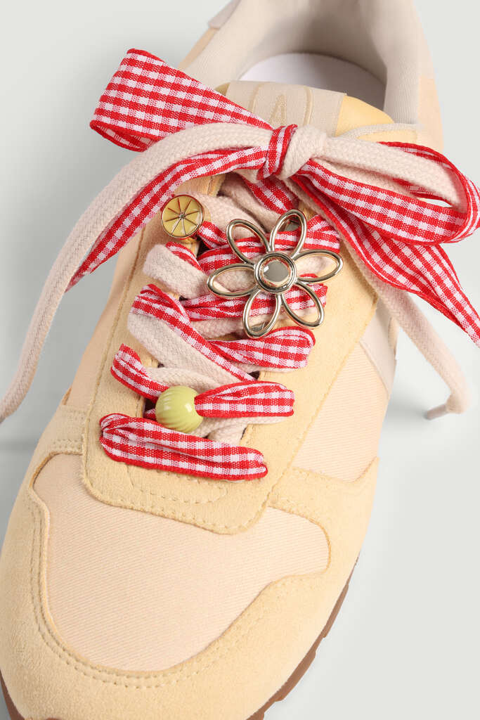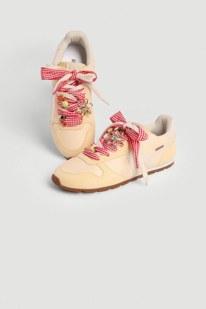O Lola convida a brincar com as possibilidades. É possível trocar as fitas dos cadarços e adicionar shoe charms — pequenas peças que revelam o humor de quem calça. De fitas transparentes a estampas em animal print, xadrez ou paisley, passando por enfeites em forma de estrelas, corações e frutinhas, o tênis se transforma em extensão da identidade de cada um.