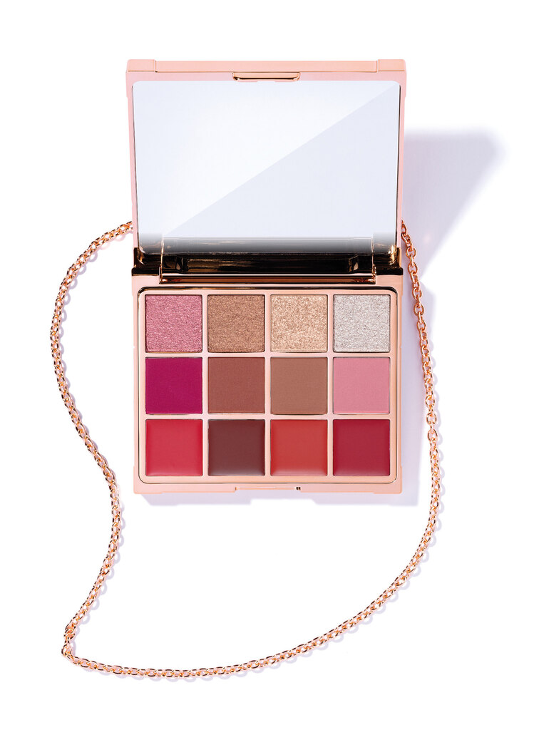 Dentro, são 12 cores intensas: oito tons em acabamentos matte e cintilante, e quatro cremosos multifuncionais que também podem ser aplicados nos lábios. O espelho e a alça integrados completam o design pensado para acompanhar a rotina e os momentos especiais com a mesma elegância.