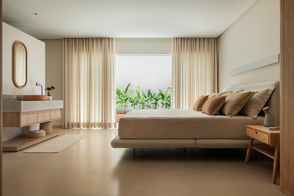 • Materiais de baixo impacto: o uso de microcimento nos pisos substitui revestimentos cerâmicos tradicionais, conferindo frescor e reduzindo resíduos na obra. A estrutura de EPS também contribui para minimizar a transferência de calor para o interior.
