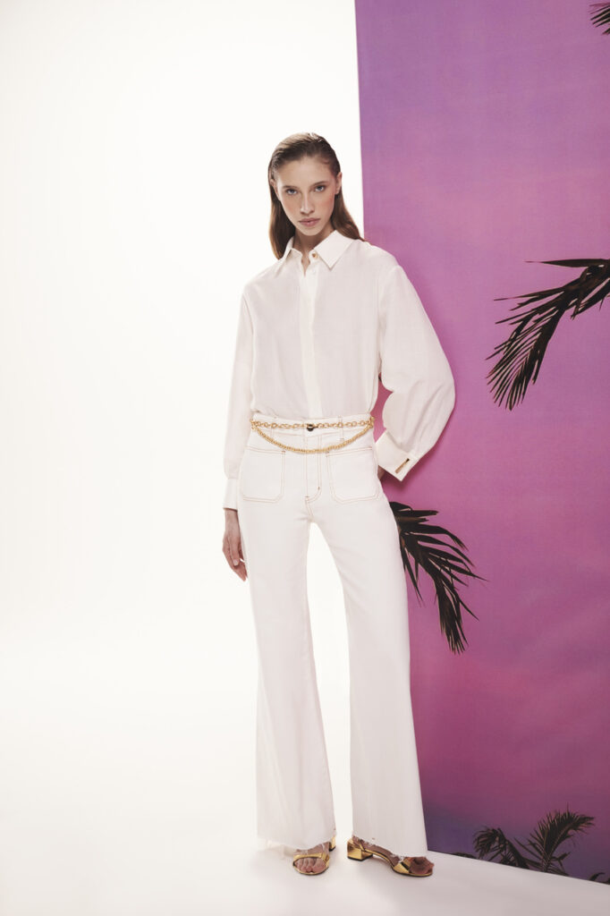 Entre os destaques está a bermuda Jessie, com modelagem que remete a uma saia, volume feminino e inspiração náutica. A coleção também apresenta diferentes modelos de calças, como a versão em sarja off-white com pespontos ocres e bolsos frontais, além da calça Letícia, em linho, com transpasse frontal. O modelo Scarlett completa a seleção com modelagem confortável e prega profunda na frente.