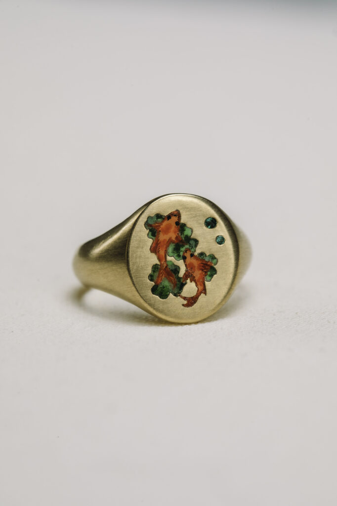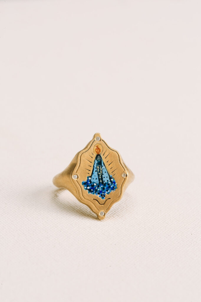 Daí em diante, seguem-se modelagem, fundição, lapidação e acabamento do ouro. Só então começa a etapa mais delicada: a micro pintura, realizada pela própria fundadora, em um rito de concentração — traço a traço, camada sobre camada. Cada joia leva, em média, 30 dias para ficar pronta e é entregue em estojo de madeira laqueada com interior em camurça.