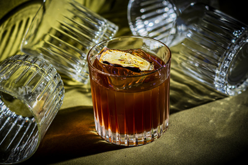 Já o Old Fashioned Cherry & Coke explora notas escuras e aromáticas com xarope artesanal de Coca-Cola e cereja, preparado a partir de redução da bebida com ameixa in natura; a mistura resfriada no mixing glass traz camadas quase resinosas ao bourbon single barrel. O France Connection combina o calor do cognac Rémy Martin VSOP à sutileza de um Disaronno contido e recebe um acabamento de conhaque infusionado em café, extraído a frio para intensificar aroma sem trazer amargor.