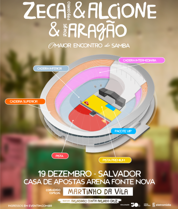 Três ícones do samba sairão em turnê, juntos, em 2026. Produzido pela 30e, o show Zeca Pagodinho & Alcione & Jorge Aragão – O Maior Encontro do Samba tem estreia prevista para 6 de junho, no estádio do Maracanã, no Rio de Janeiro. Em Salvador, a apresentação será na Arena Fonte Nova, sábado, 19 de dezembro, às 20h. O Itaú oferece pré-venda exclusiva para seus clientes até terça-feira, 10. A venda geral começa na quinta-feira, 11, pelo site da Eventim. Os ingressos custam a partir de R$ 72,50.
